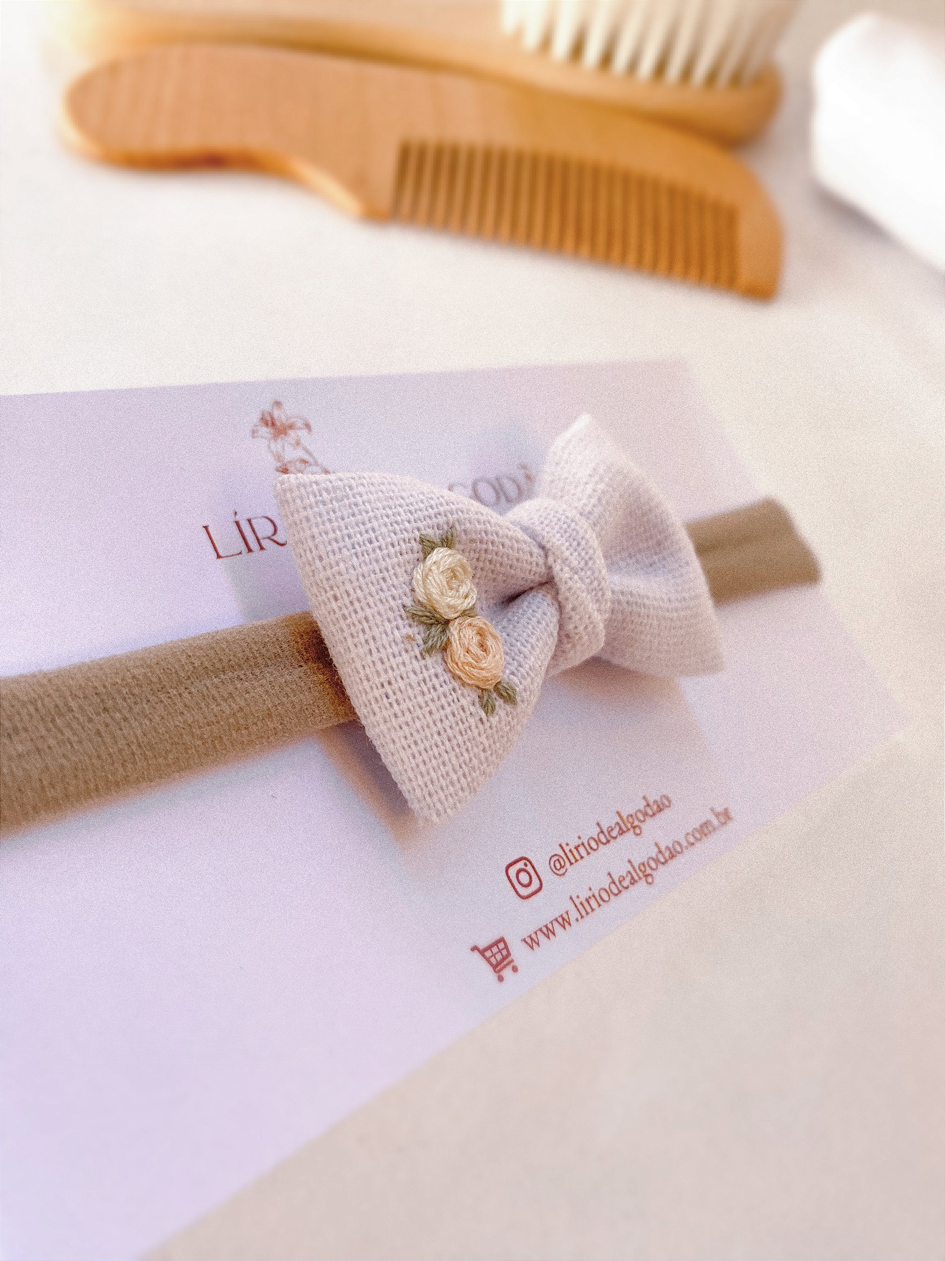 Laço de tecido linho. Com arranjos florais bordados à mão.