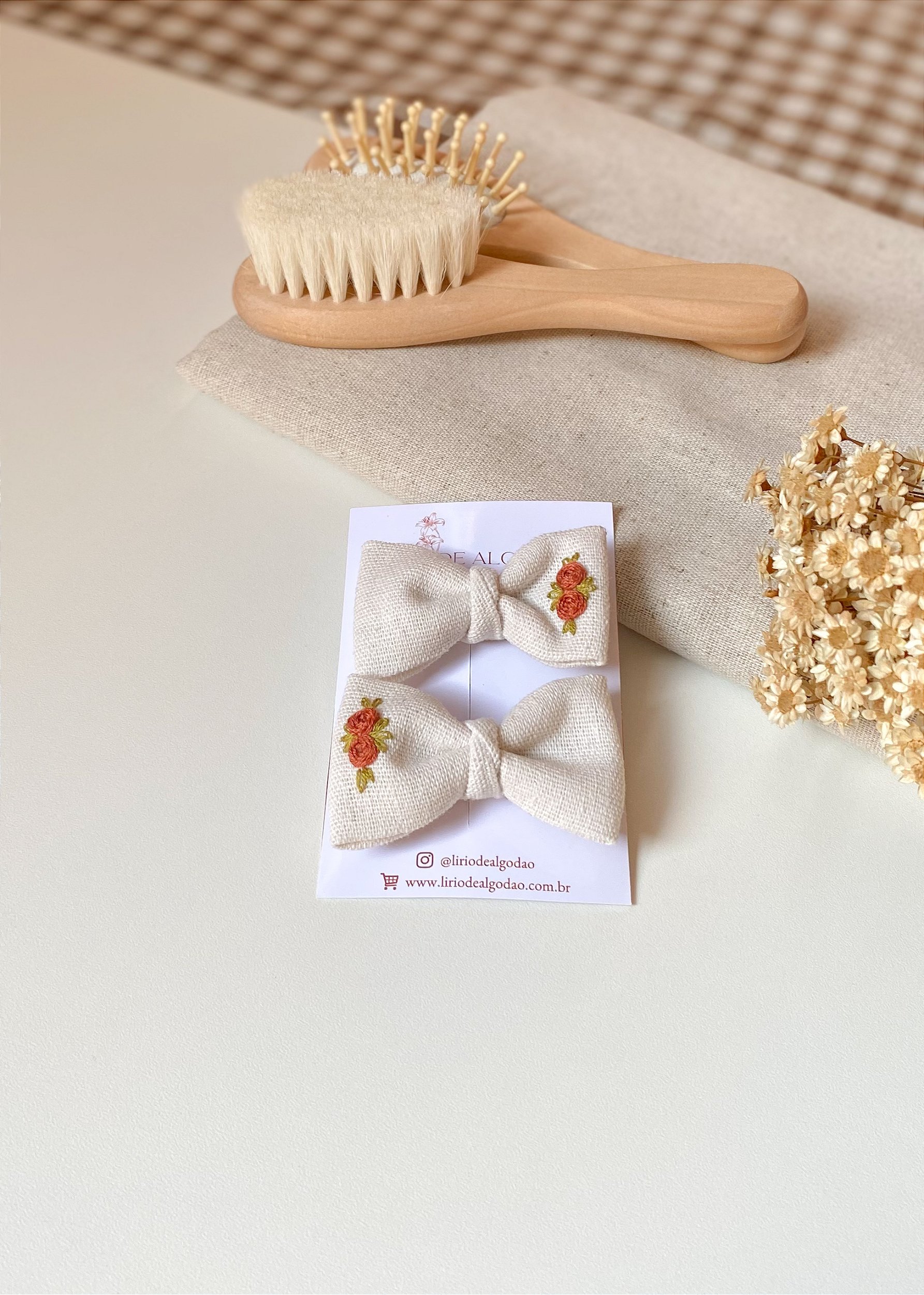 Laço de tecido linho misto. Com arranjos bordados a mão.