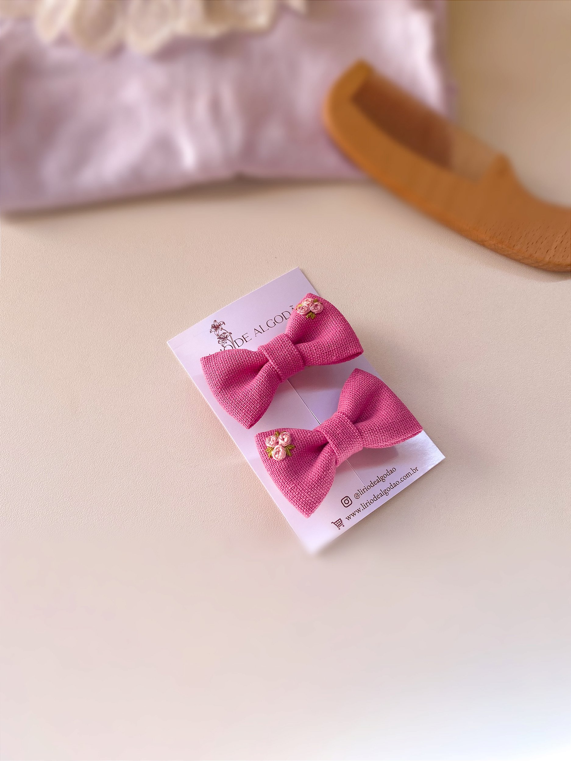 Somos uma loja de laços de tecido bordados a mão com muito afeto.